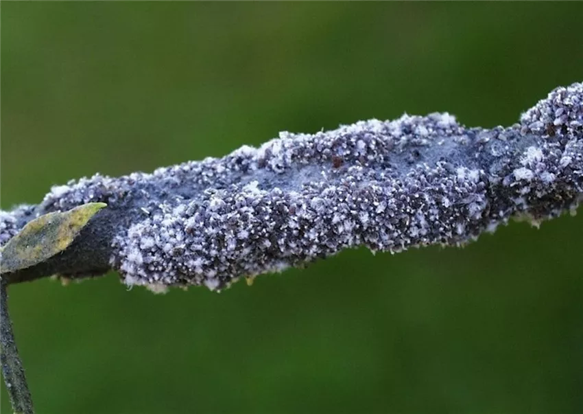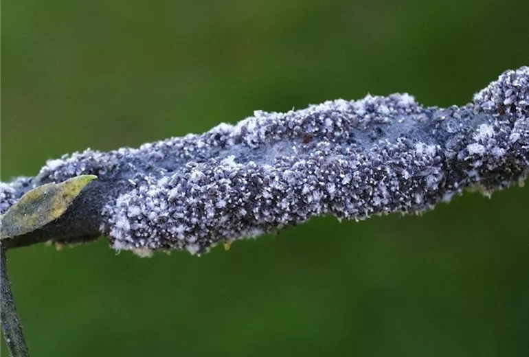 Ab Mitte Mai treten an Wund- und Schnittstellen, etwas später auch an jungen Trieben, bläulichweiße, wattebauschähnliche Gebilde auf. Darin befinden sich Kolonien plump gebauter bis 2 mm langer graubrauner Läuse.