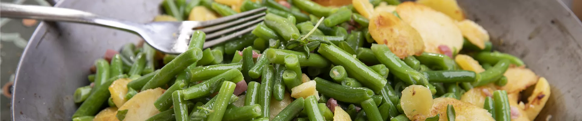 Die Brechbohnen in die Pfanne geben und alles gut miteinander vermengen. Mit Salz, Pfeffer und Bohnenkraut abschmecken. Das Bohnenkraut vorher fein hacken.
