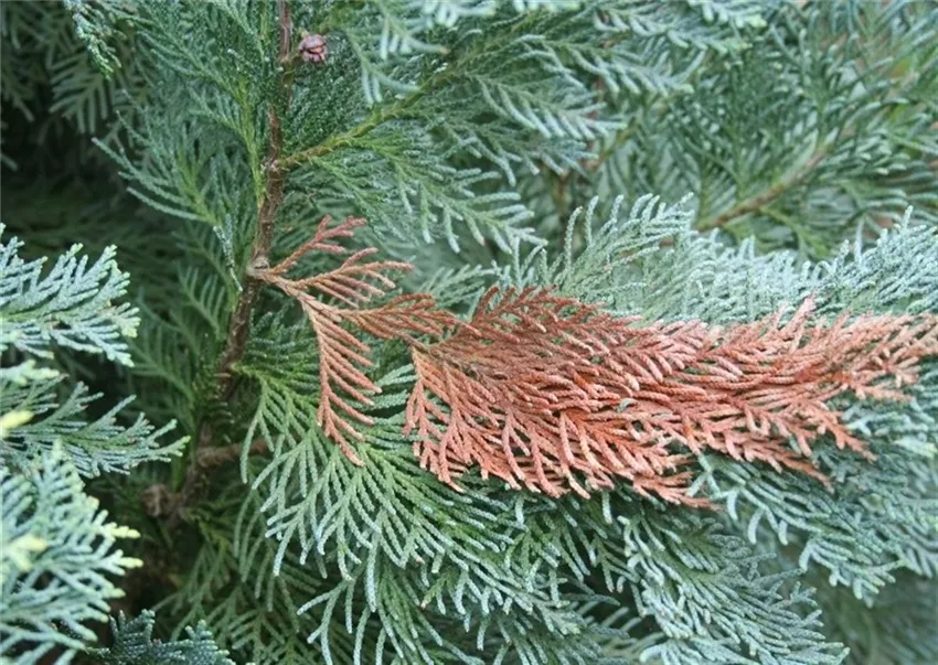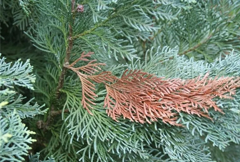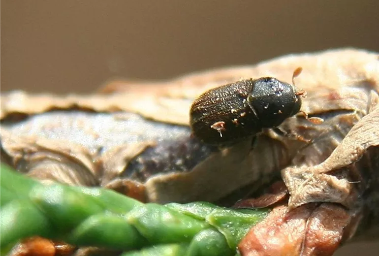 An Scheinzypresse schädigen verschiedene Käferarten der Gattung Phloeosinus. Die dunklen, ca. zwei Millimeter großen Käfer schlüpfen im Frühjahr (Mai/Juni). Sie fressen anfangs an jungen Trieben. Durch diesen Reifungsfraß kommt es zu dem unter 1. beschriebenen Schadbild.