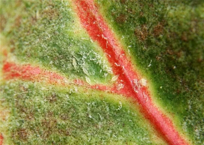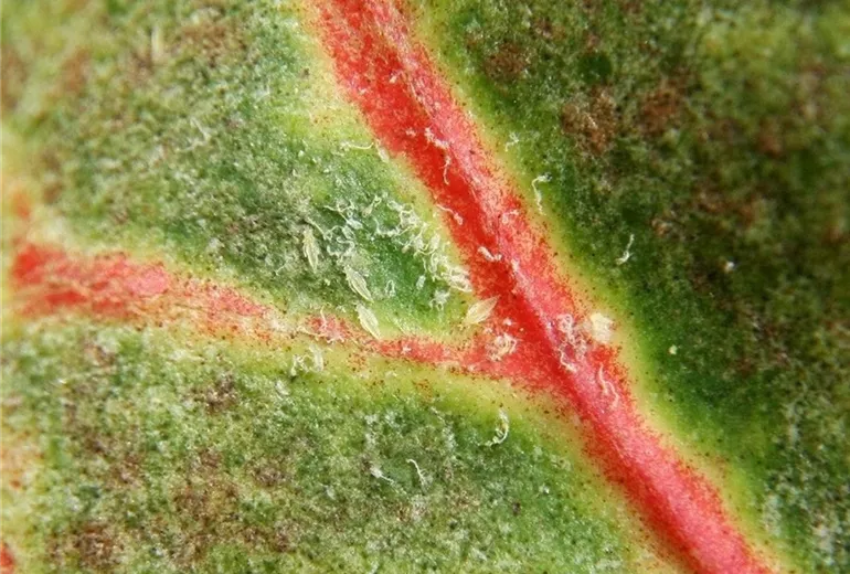 Ein ganz ähnliches Schadbild kann durch Spinnmilben verursacht werden. In diesem Fall fehlen jedoch die schwarzen Kottröpfchen und mit Hilfe einer Lupe sind die kugeligen Spinnmilben gut zu erkennen.
