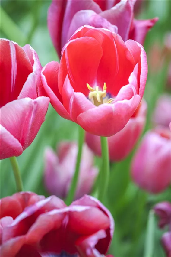 Auch wenn Tulpen heute kein Statussymbol mehr sind, bereichern sie doch den Garten. Keine Angst: Wenn Sie heute dem Tulpenwahnsinn verfallen, so werden Sie nur mit bunten und abwechslungsreichen Beeten belohnt. Immerhin gibt es etwa 150 Arten und 4000 Tulpen-Sorten zu entdecken. Es gibt frühe und späte Tulpen, Triumph-Tulpen, Lilienblütige Tulpen, Darwin-Hybriden, Wildtulpen oder besondere Züchtungen wie gemusterte Papageientulpen, Crispa-Tulpen mit gefransten Blütenrändern, grüngestreifte Viridiflora-Tulpen oder gefüllte Tulpen. Auch wenn die Blumen eher durch Farbe bestechen, finden Sie sogar Sorten für Ihr Duftbeet. Ob einzeln zwischen Rosen gepflanzt, kombiniert mit anderen Frühblühern oder in Gruppen: Tulpen erzielen immer einen frühlingshaften Effekt im Blumenbeet. Einfarbig, eng beeinander liegende Farbtöne oder doch lieber kunterbunt? Tulpen bieten Ihnen alle Möglichkeiten.