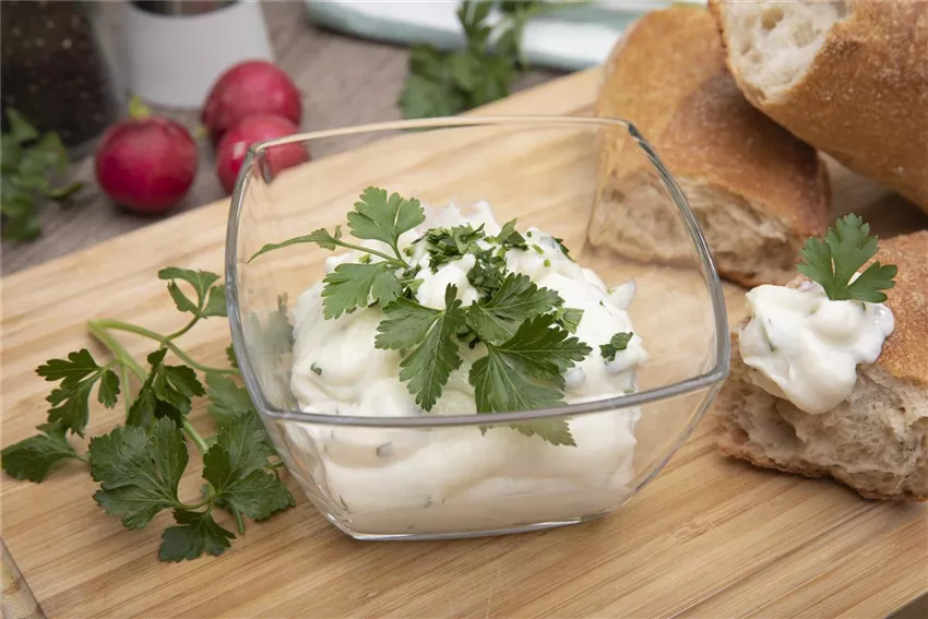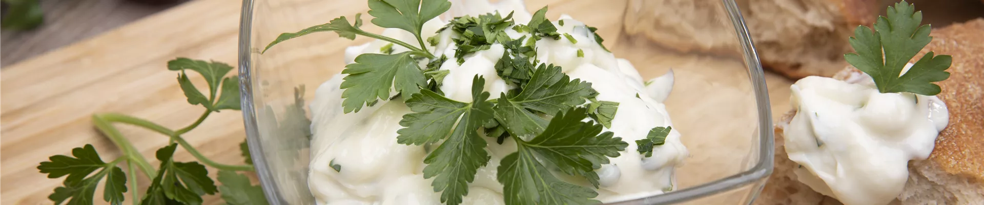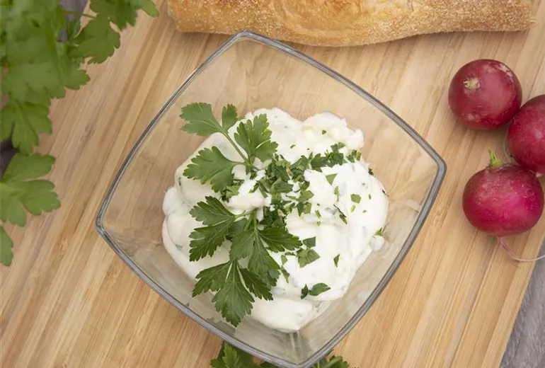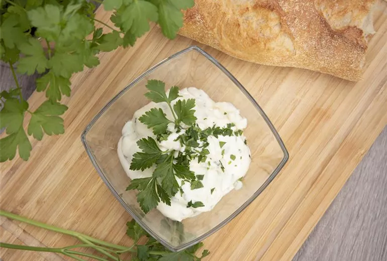 Die gehackte Petersilie mit der Schlagsahne unter die Mayonnaise heben. Anschließend mit Salz und schwarzem Pfeffer abschmecken und bis zum Servieren gut durchziehen lassen, damit die Gewürze ihr Aroma an die Mayonnaise abgeben können.