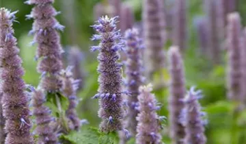 Zum Verzehr geeignet. Agastache foeniculum bildet in Rispen angeordnete, violette Blüten ab Juni. Diese verströmen einen angenehmen Duft.