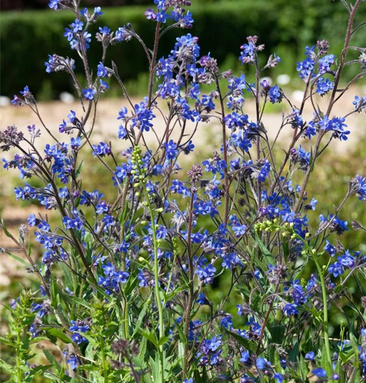 Anchusa azurea bildet trichterförmige, in Rispen angeordnete, blaue Blüten ab Juni.