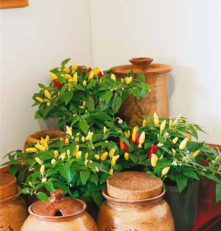 Besonders dekorativ sind die gelben, grünen, roten Früchte von Capsicum annuum 'Feuerküsschen'. Diese erscheinen ab Juli.